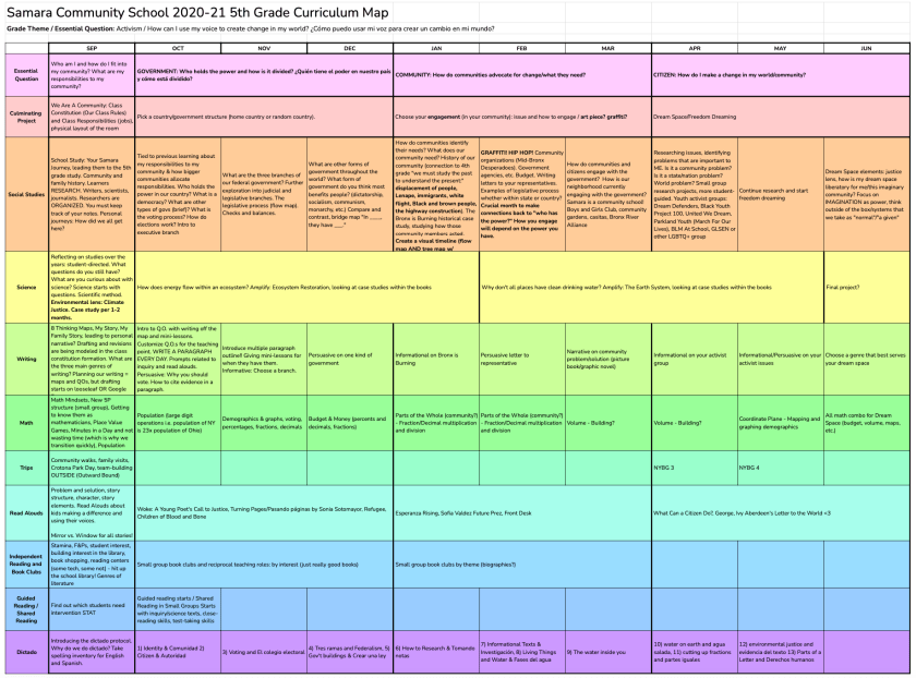A curriculum map is an at-a-glance overview of your whole year — every month, every subject — so that you can see how all of the pieces of the puzzle fit together. At Samara, where each grade has a theme/essential question, we made sure to include essential questions for our 3 major PBL units, as well as field trips and culminating projects.