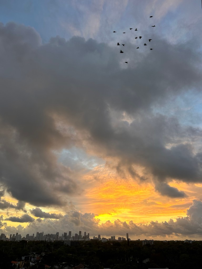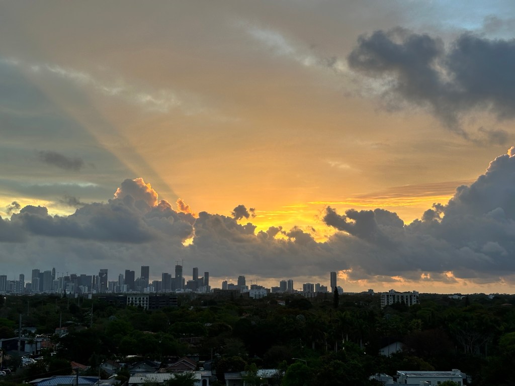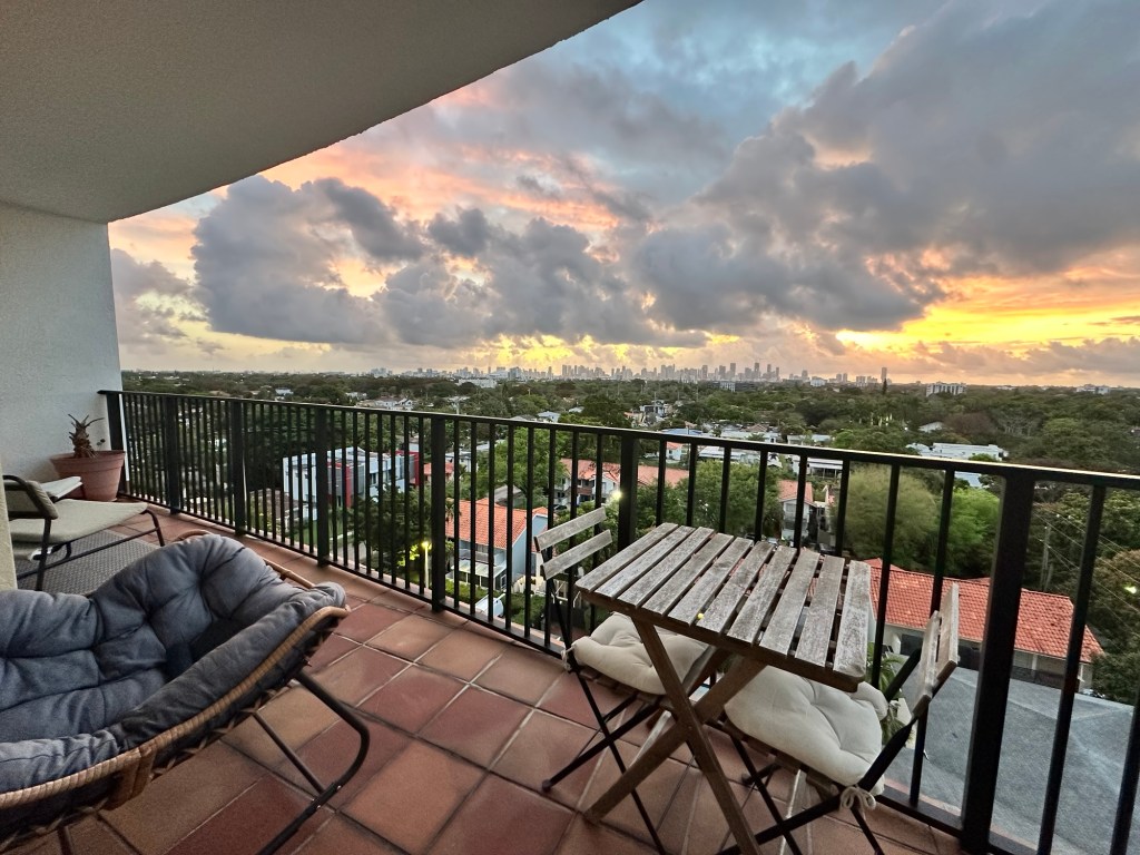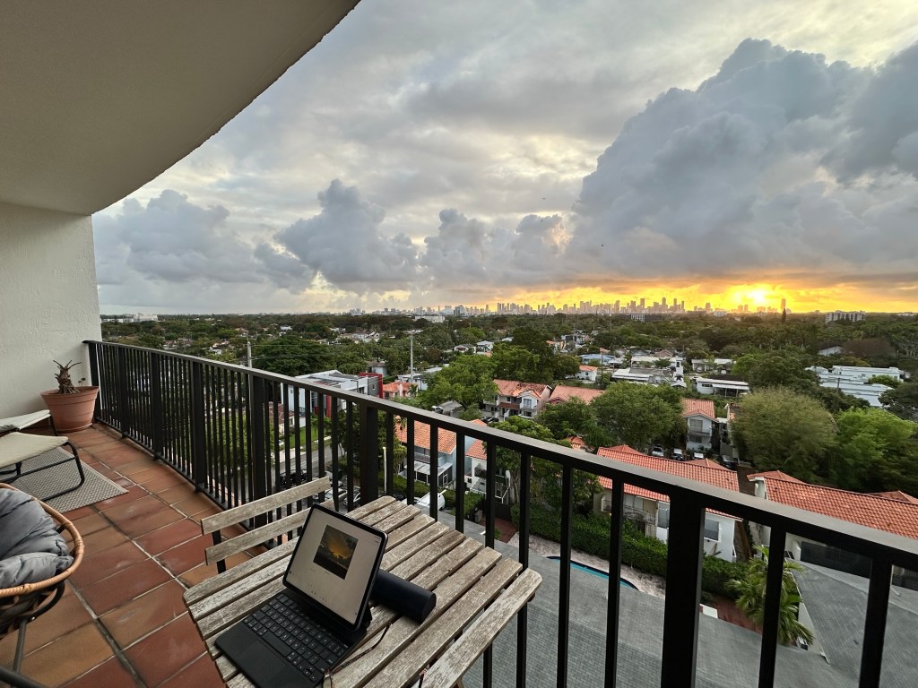 In our new apartment, we look out over a quiet neighborhood filled with trees. We can see the Miami skyline, the sun rising above it every morning with spectacularly colorful displays, entering our home and warming it right up with its light.