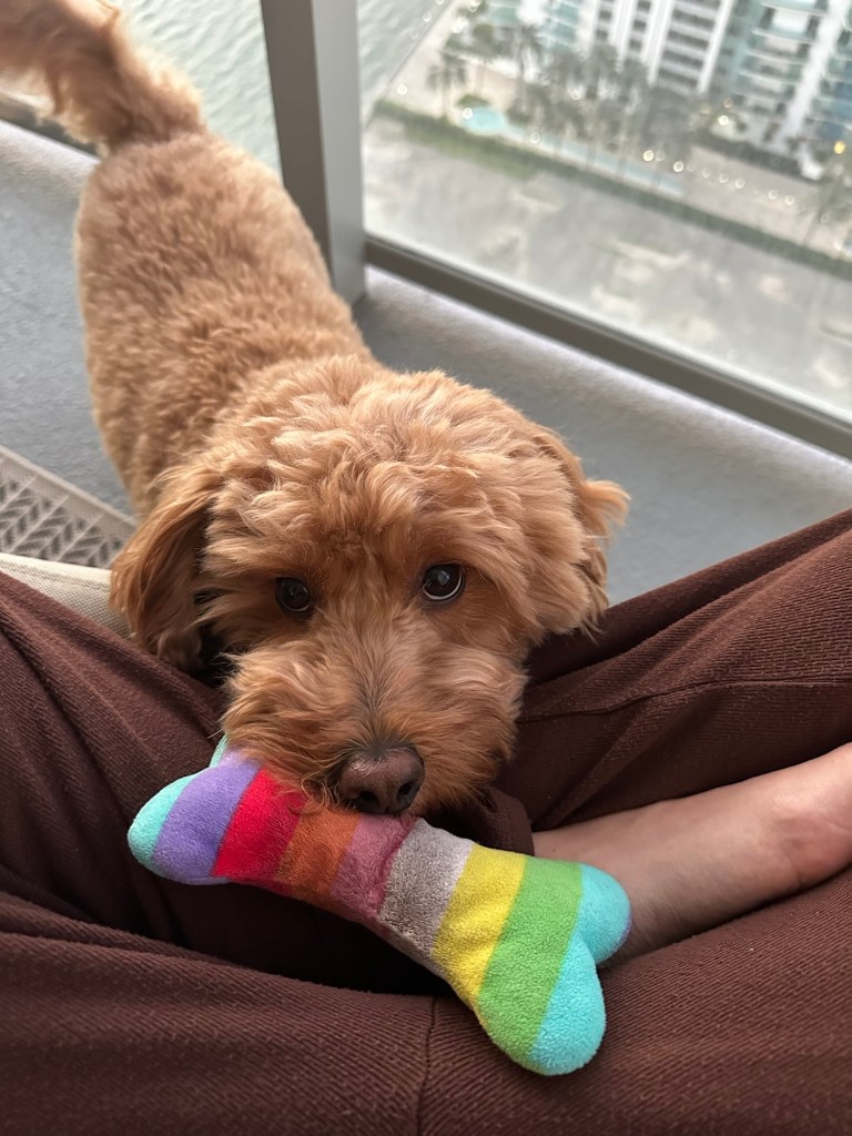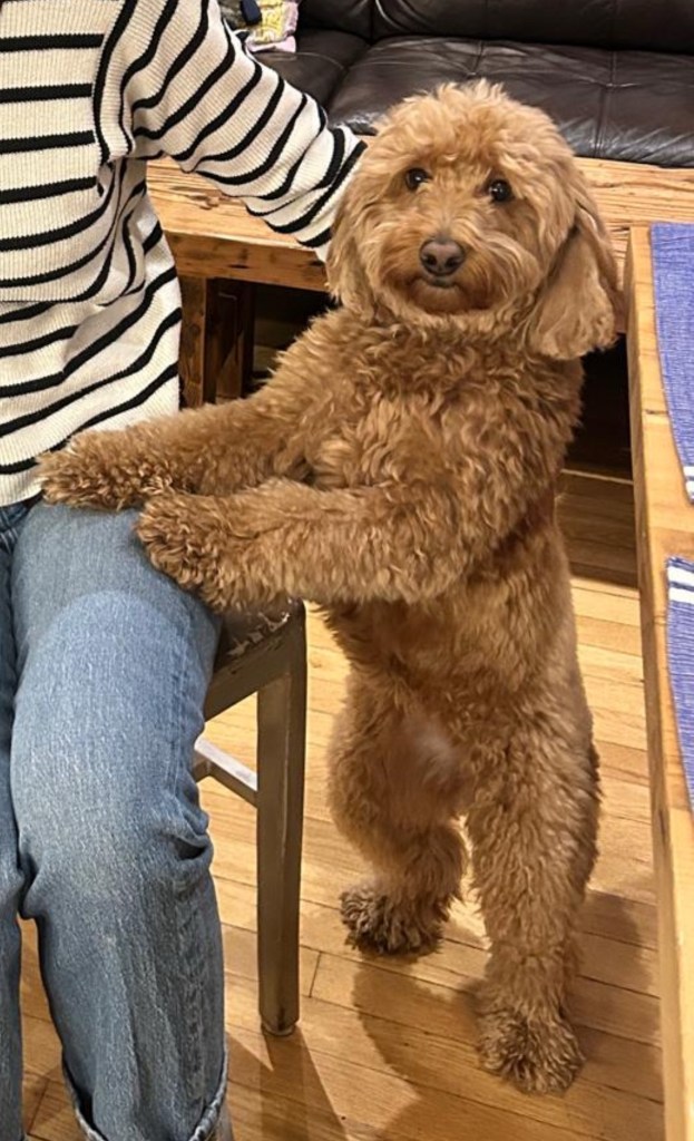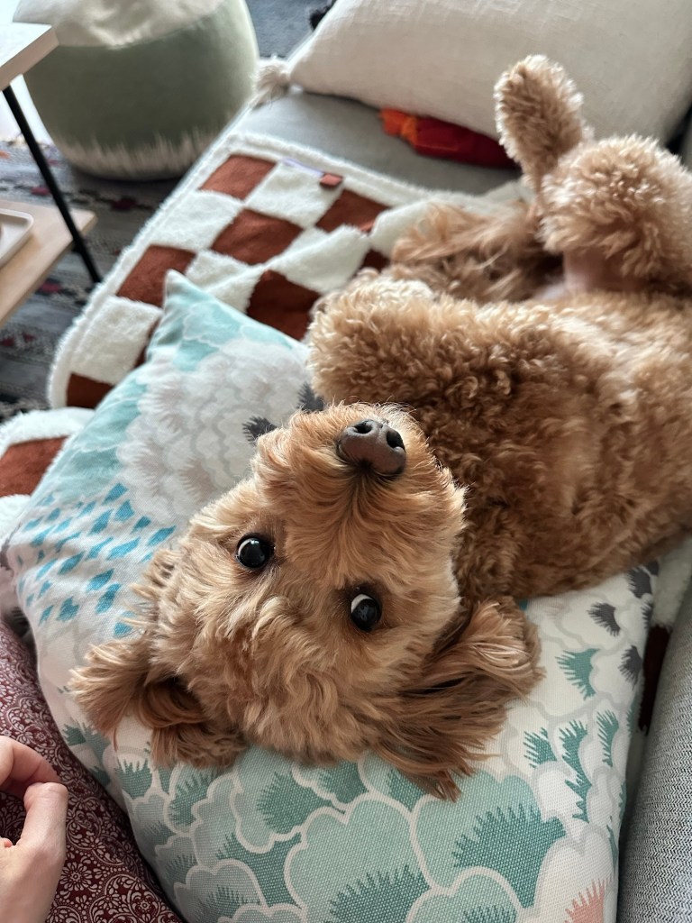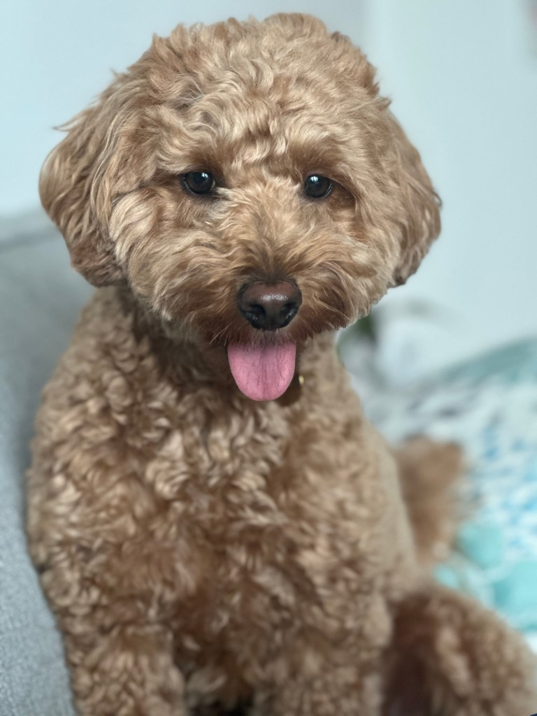 Phoebe is a fluffy toy golden doodle who loves nothing more than to snuggle up on whoever’s closest, lick whatever part of their body she can get her tongue on, and roll over to enjoy the belly rubs.