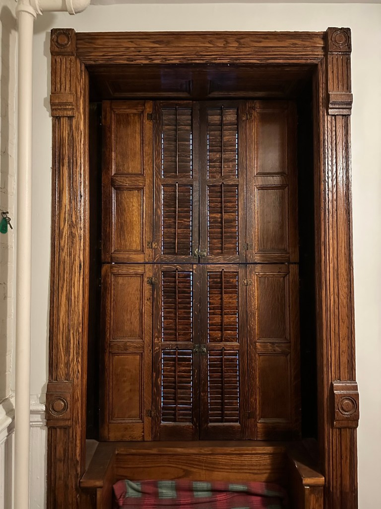 The blackout shutters, wooden with slats, a typical feature of almost all brownstones in New York. They block out all the light, turning my bedroom here into the perfect cave, pitch black until I’m ready to wake up.