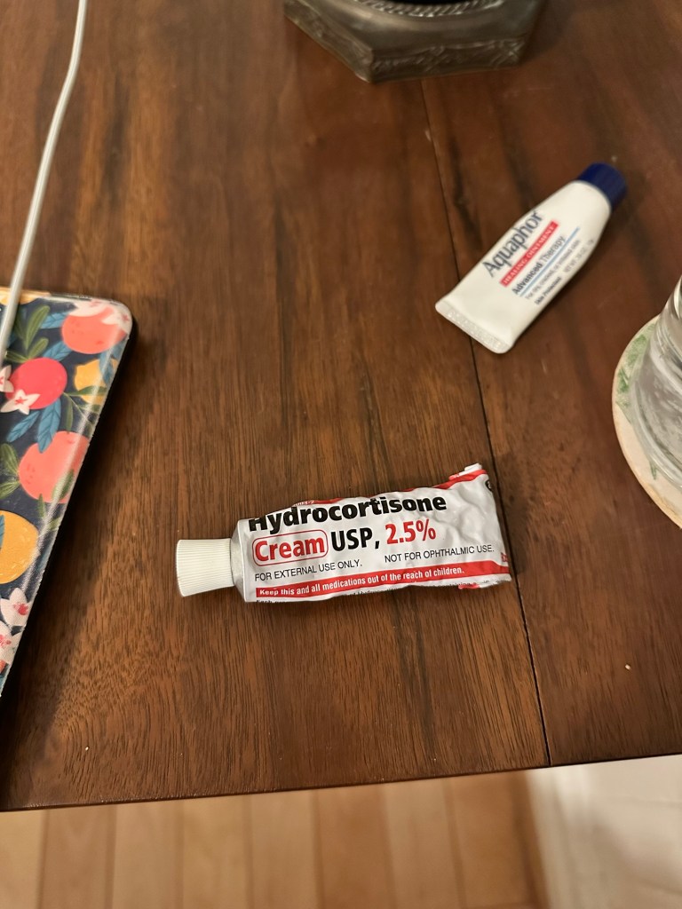 Hydrocortisone cream on the nightstand because the eczema on my knuckles always acts up when I travel, especially if the weather is different from Miami.