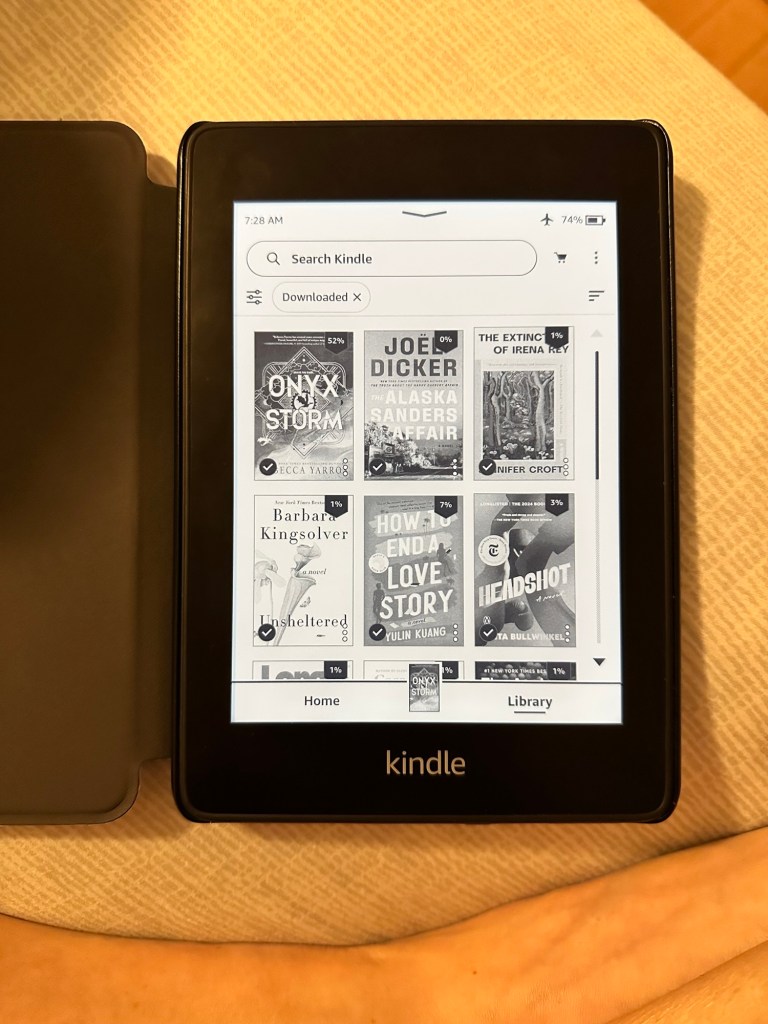 My kindle with about 9 or 10 library loans on it. Do you know the trick for keeping library loans as long as you’d like on your kindle? If not, I’ll let you in on the secret now: as soon as you deliver the books to your kindle, put it on airplane mode. Then, even when they officially get returned to the library, they’ll remain on your kindle until you read them!