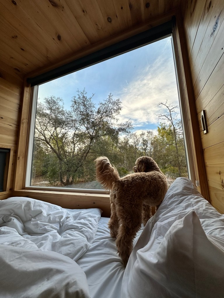 We’re staying at a Postcard Cabins getaway in a small cabin with a huge window. As we watched the first episode of Adolescence (I was ready to keep watching; Patrick needs longer to digest each episode of a crime thriller), we kept the shade down for privacy in case any other residents were wandering the woods.