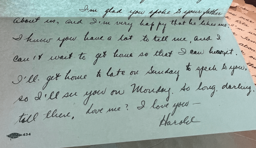 “I’m glad you spoke to your father about us, and I’m very happy that he likes me. I know you have a lot to tell me, and I can’t wait to get home so that I can hear it. I’ll get home to [sic] late on Sunday to speak to you, so I’ll see you on Monday. So long, darling, till then, love me? I love you — Harold”